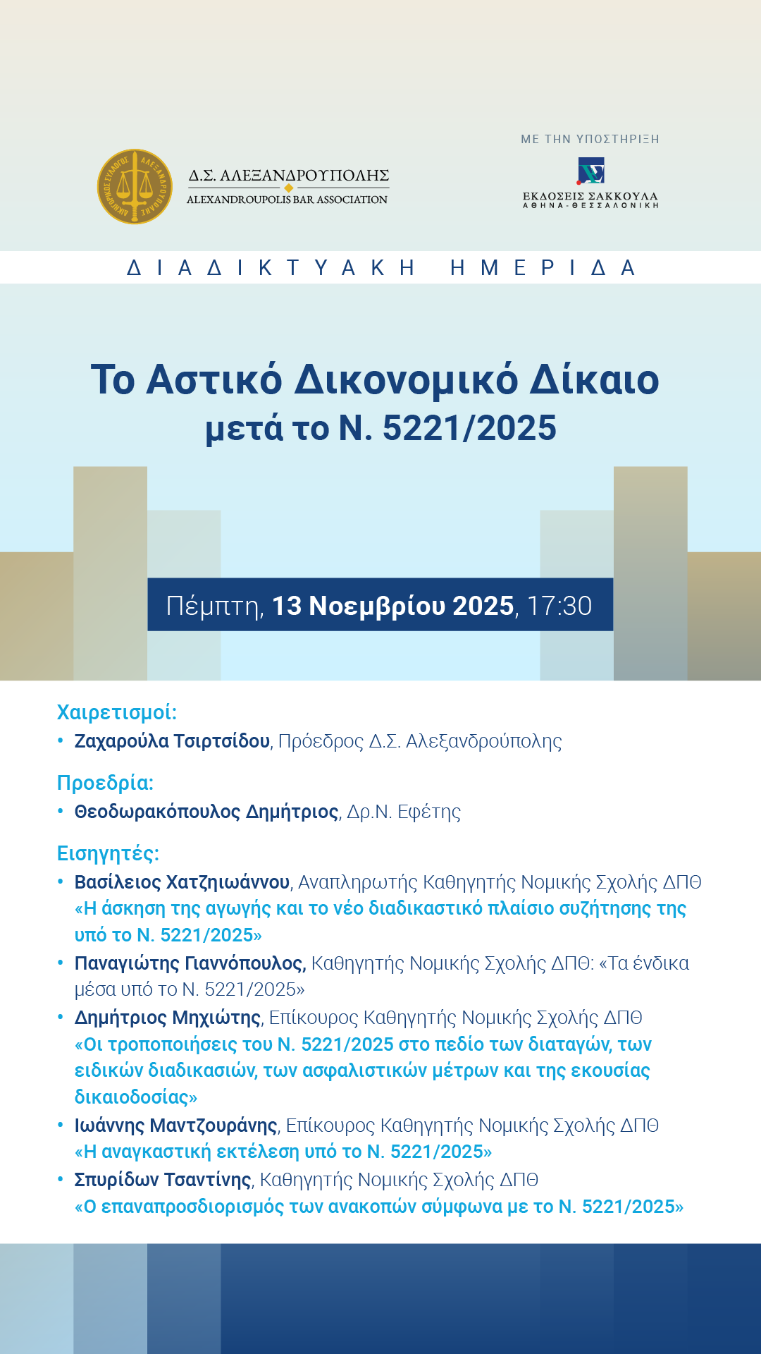 Αρχική > newsletter > Διαδικτυακή Ημερίδα: Το Αστικό Δικονομικό Δίκαιο μετά το Ν. 5221/2025 mobile - ενημέρωση, newsletter, ΕκδηλώσειςΔιαδικτυακή Ημερίδα: Το Αστικό Δικονομικό Δίκαιο μετά το Ν. 5221/2025 Posted on 11 Νοεμβρίου 2025 by [email protected] ΔΙΑΔΙΚΤΥΑΚΗ ΕΚΔΗΛΩΣΗ Δ.Σ. ΑΛΕΞΑΝΔΡΟΥΠΟΛΗΣ & ΕΚΔΟΣΕΙΣ ΣΑΚΚΟΥΛΑ ΤΟ ΑΣΤΙΚΟ ΔΙΚΟΝΟΜΙΚΟ ΔΙΚΑΙΟ ΜΕΤΑ ΤΟΝ Ν. 5221/2025 ΠΕΜΠΤΗ 13 ΝΟΕΜΒΡΙΟΥ 2025, 17.30 Εγγραφή στον ακόλουθο σύνδεσμο https://www.sakkoulas.gr/el/info/events/forthcoming/diadiktyaki-imerida-to-astiko-dikonomiko-dikaio-meta-to-n-5221-2025/ Συνημμένα αρχεία: ΑΦΙΣΑ.png Εκδήλωση ΕΒΕΘ “Το νέο πλαίσιο διοικητικών κυρώσεων στο Γ.Ε.ΜΗ. με ισχύ από 1.1.2026 Υποχρεώσεις δημοσιότητας και δυνατότητες συμμόρφωσης πριν την επιβολή των κυρώσεων” Προκήρυξη Εισαγωγής Ι’ Κύκλου ΔΠΜΣ “Δίκαιο & Πληροφορική” – Αιτήσεις από 15/11/25-15/12/25