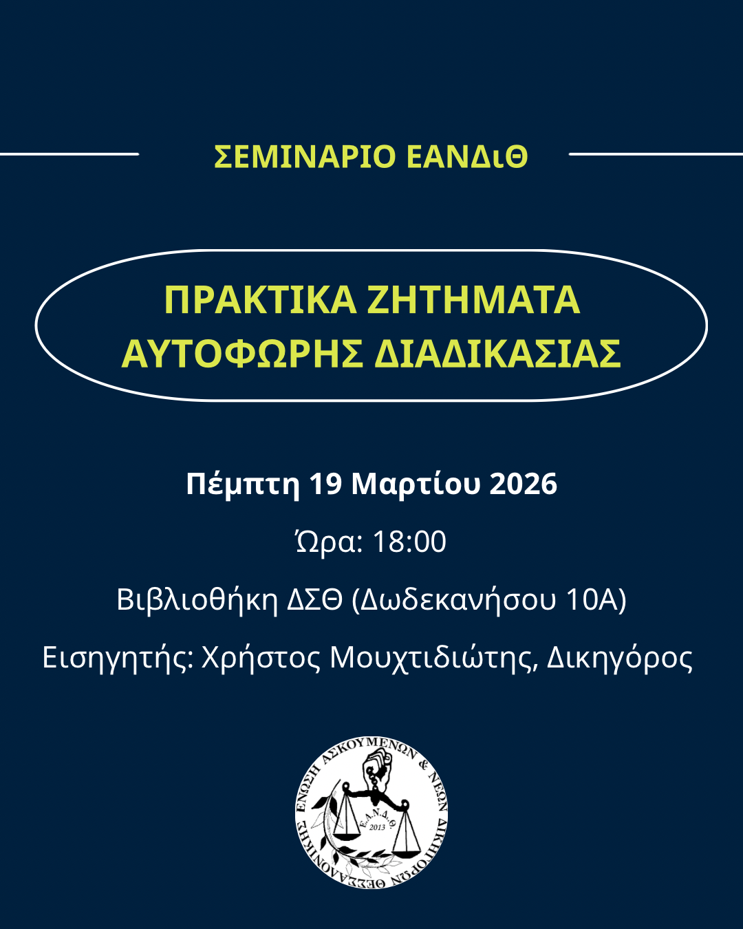 Η Ένωση Ασκούμενων και Νέων Δικηγόρων Θεσσαλονίκης (ΕΑΝΔιΘ) διοργανώνει την Πέμπτη 19 Μαρτίου 2026 και ώρα 18.00 στην βιβλιοθήκη του ΔΣΘ (Δωδεκανήσου 10Α) σεμινάριο με τίτλο “Πρακτικά ζητήματα αυτόφωρης διαδικασίας” με εισηγητή τον Χρήστο Μουχτιδιώτη (Δικηγόρος ΔΣΘ).